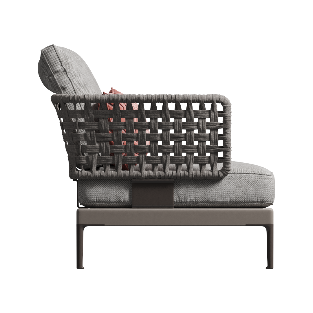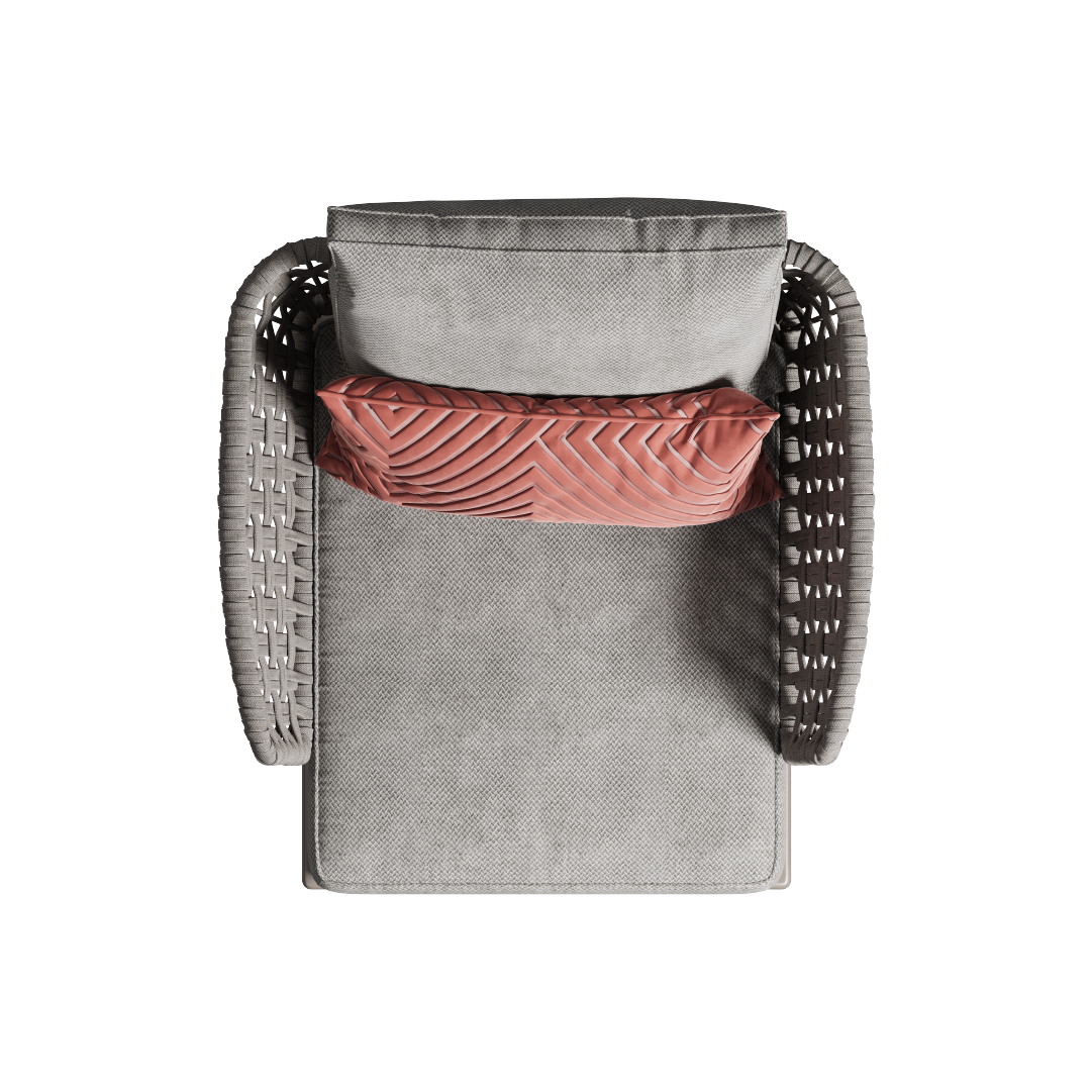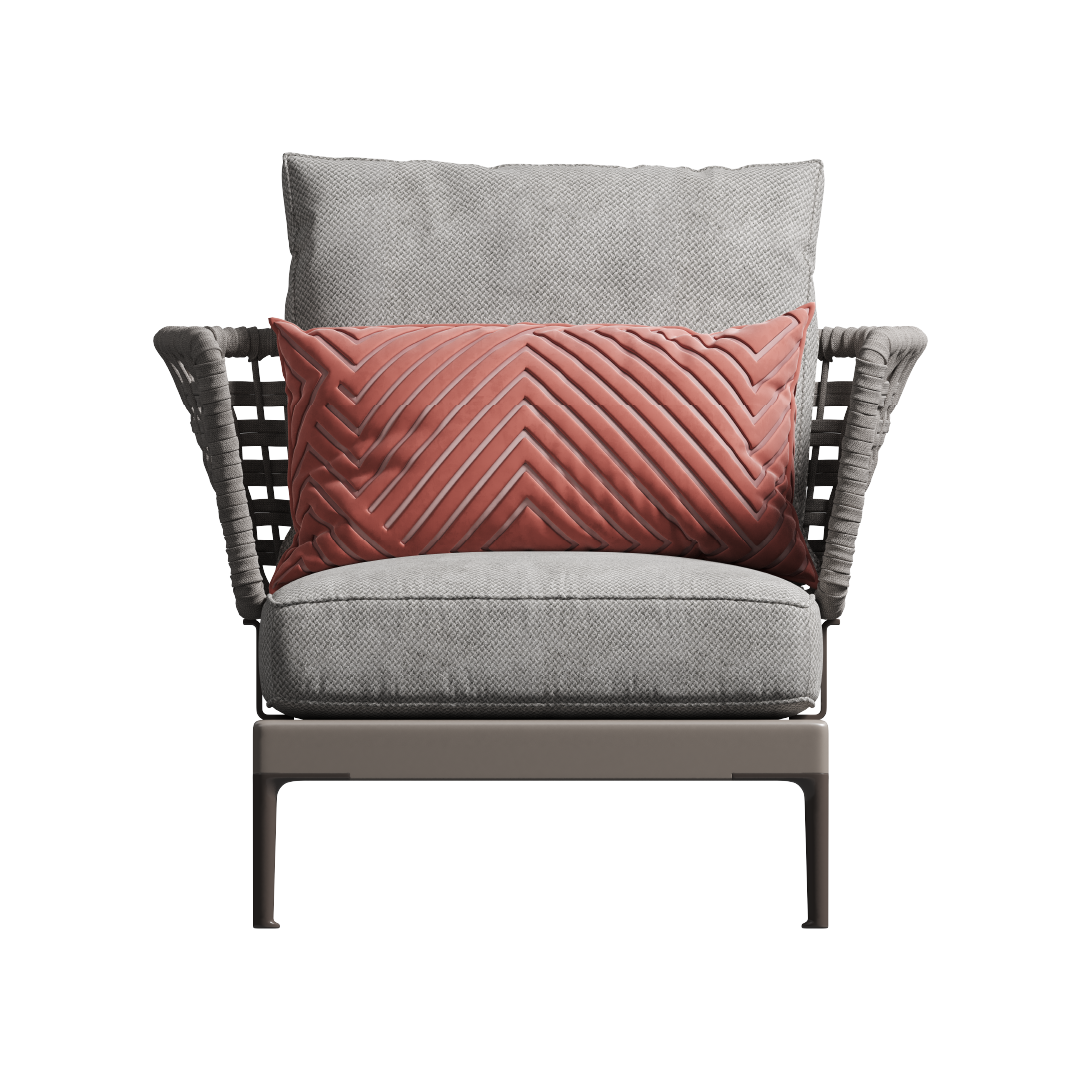 • The armchair features a woven backrest and comfortable cushions, suitable for outdoor relaxation.