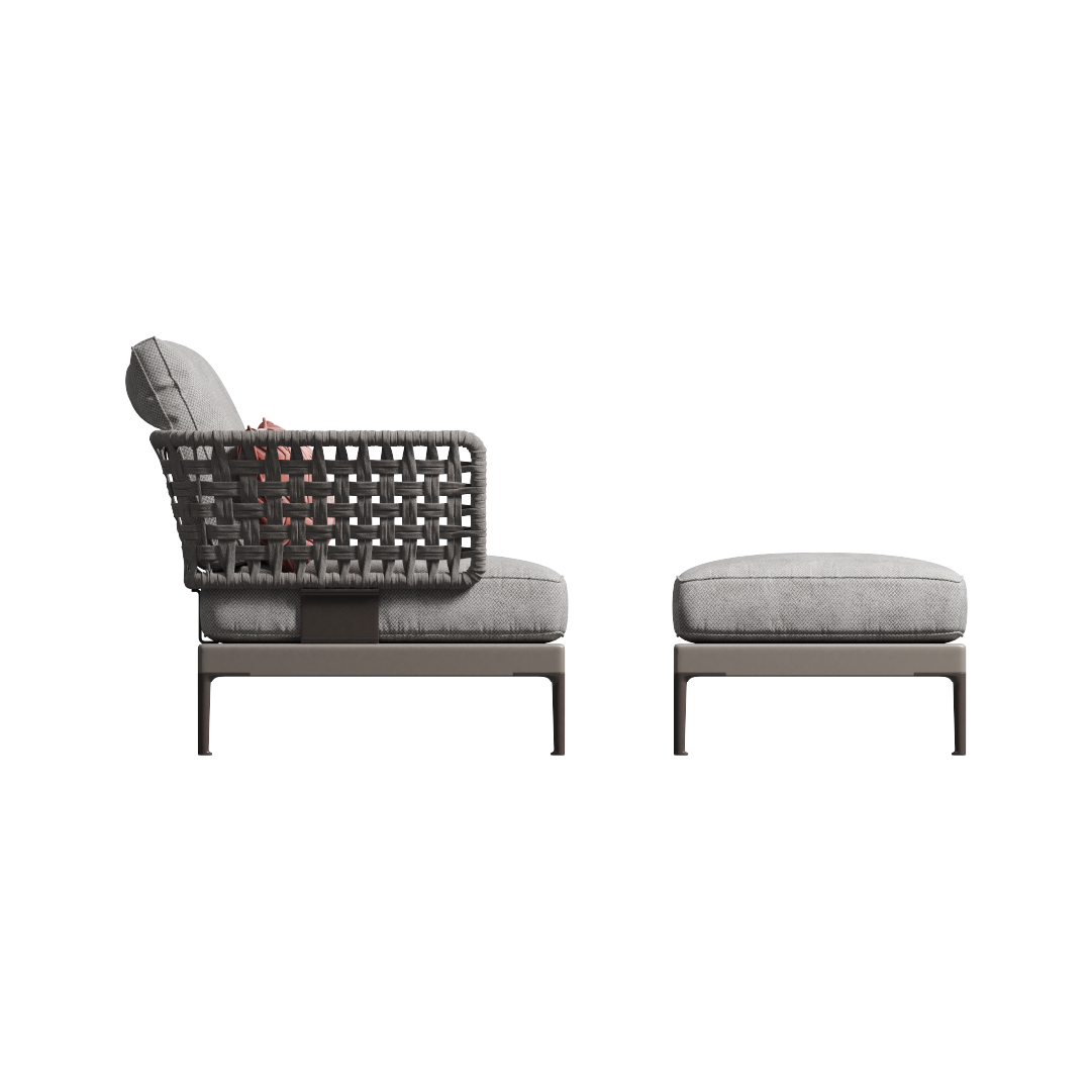 Patio armchair and ottoman designed (This furniture set combines aesthetic appeal with functional design, making it a stylish and practical addition to any outdoor setting) and classic-modern lifestyle approach. This set is part of outdoor furniture, also known as patio furniture, which is specifically designed for outdoor use and is typically made of weather-resistant materials such as rust-proof aluminium.