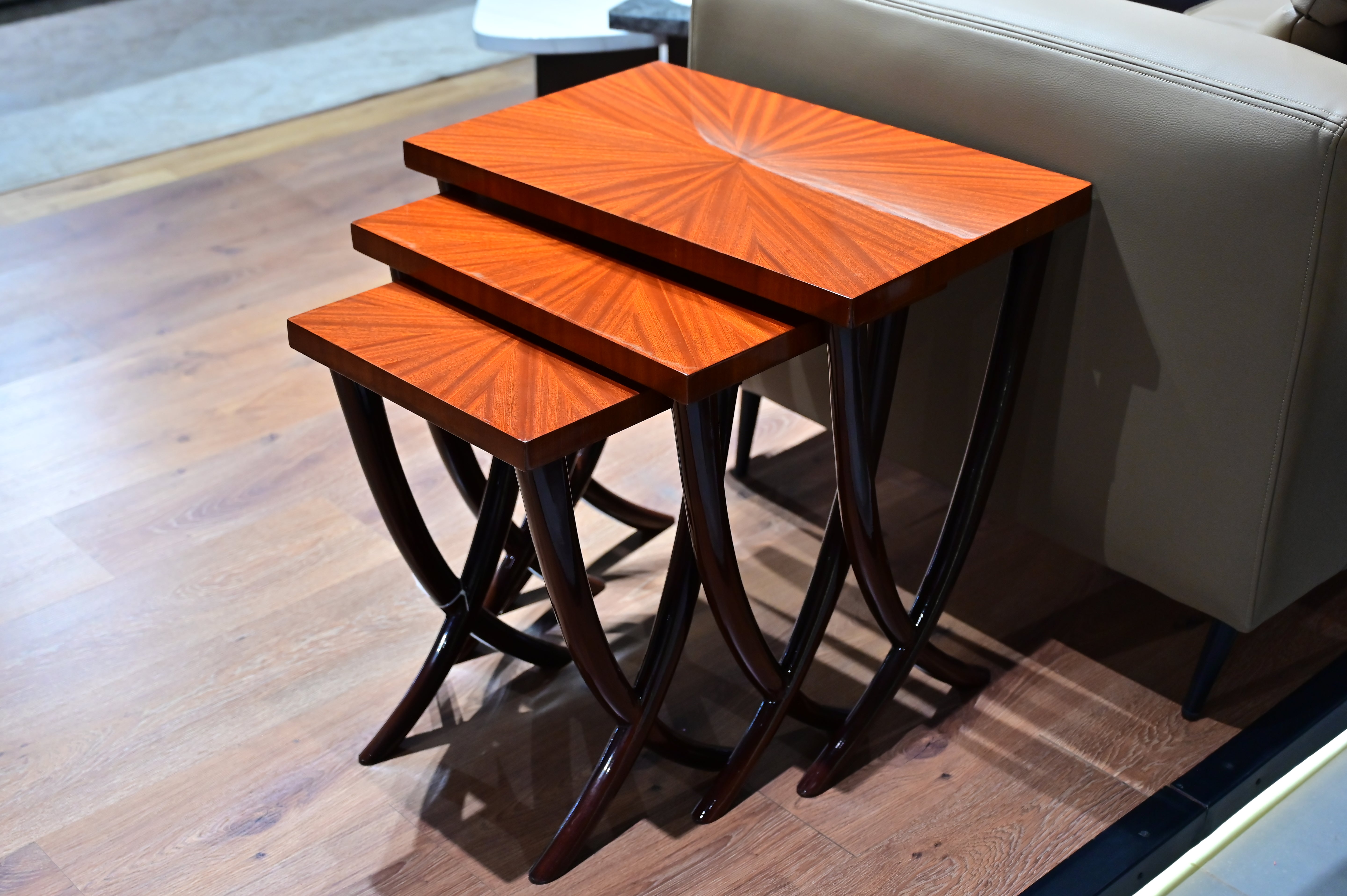 A set of nesting tables made of wood. The tables have a glossy finish and a distinct wood grain pattern, made of a hardwood. Width: 22 inches, Height: 20 inches, Depth: 16 inches