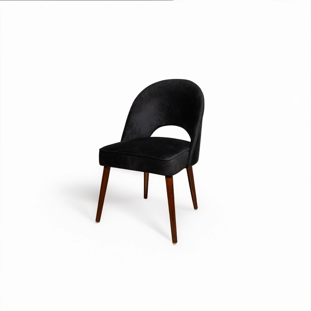This type of chair is often used in dining rooms or living rooms and is known for its comfort and stylish appearance. The dark color and soft material of the chair would be a comfortable seating option, while the wooden legs add a touch of natural warmth to the design. Dimensions: 20.28"D x 18.5"W x 29.72"H , Material: Black velvet dining chair with wooden legs.