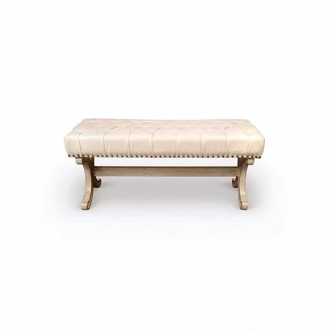 The furniture is characterized by a light, possibly off-white or cream color, with a slightly distressed or aged finish, giving it a vintage or shabby-chic appearance. H- 1'-10" , W- 1'- 8" ,L- 4'-1"