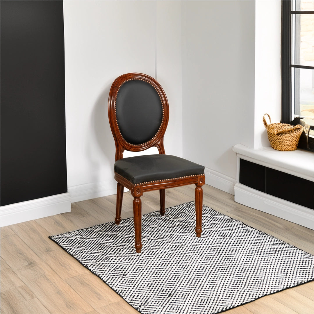 The wooden chair adorned with a polish, emanates an aura of timeless elegance. Its regal charm is further accentuated by an emerald leather cushioned base and back, inviting indulgence in comfort. Material: Wood, Leather, Finish powder coating, Dimension: 18"x23.6"x 38.5"