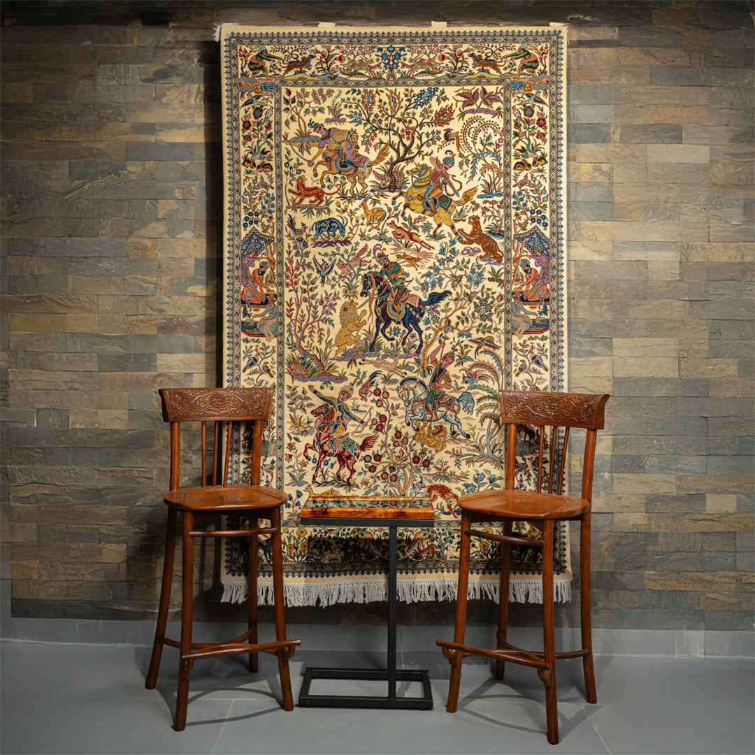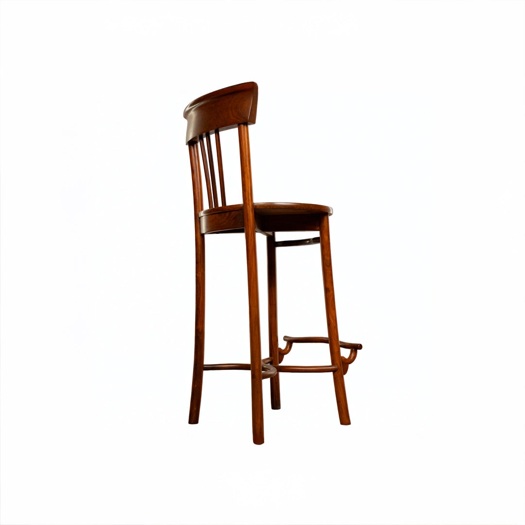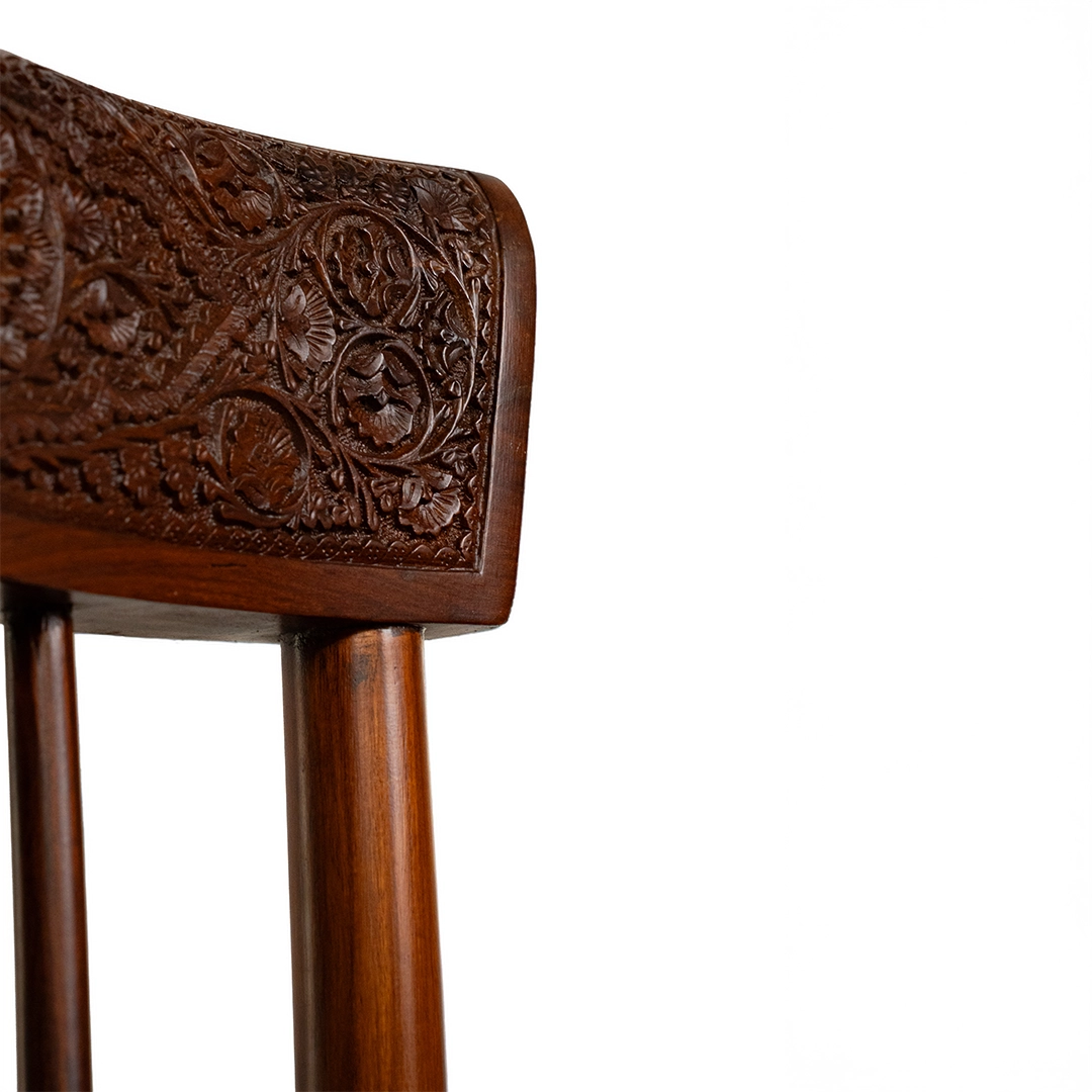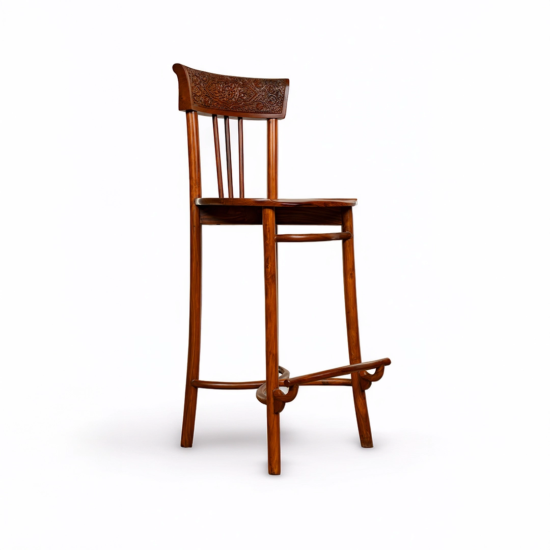 A carved back rest, a simple round seat and a tall, slender structure supported by 4 legs with connecting rungs. Material: hard wood, Dimension: h- 45", seat dia -18", backrest 14" above seat.